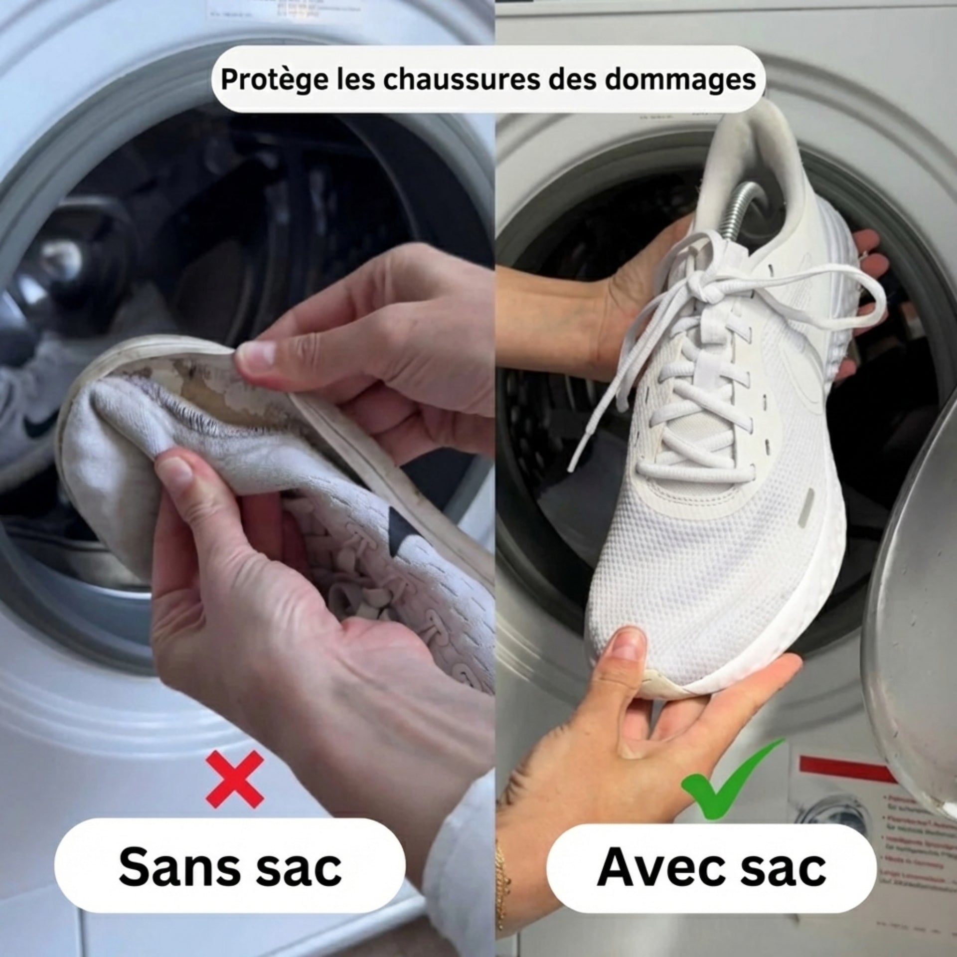 Si les chaussures sont imperméables, elles peuvent généralement être lavées dans le sac. En cas de doute, consultez les instructions d'entretien.